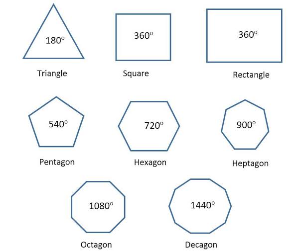 E.g.:- By applying digital root method (In this method single number obtained by adding the number successively. E.g. 347=3+4+7=14=1+4=5.) to the total angles of polygon shapes we get the following results:-